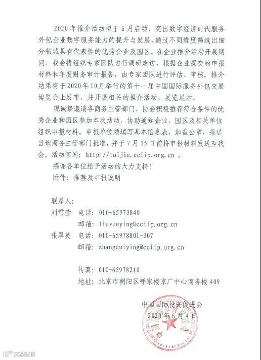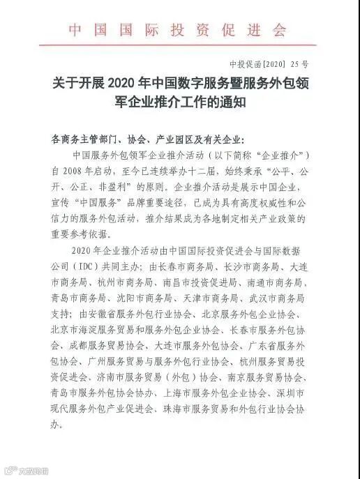 转发 关于开展2020年中国数字服务暨服务外包领军企业推介工作的通知