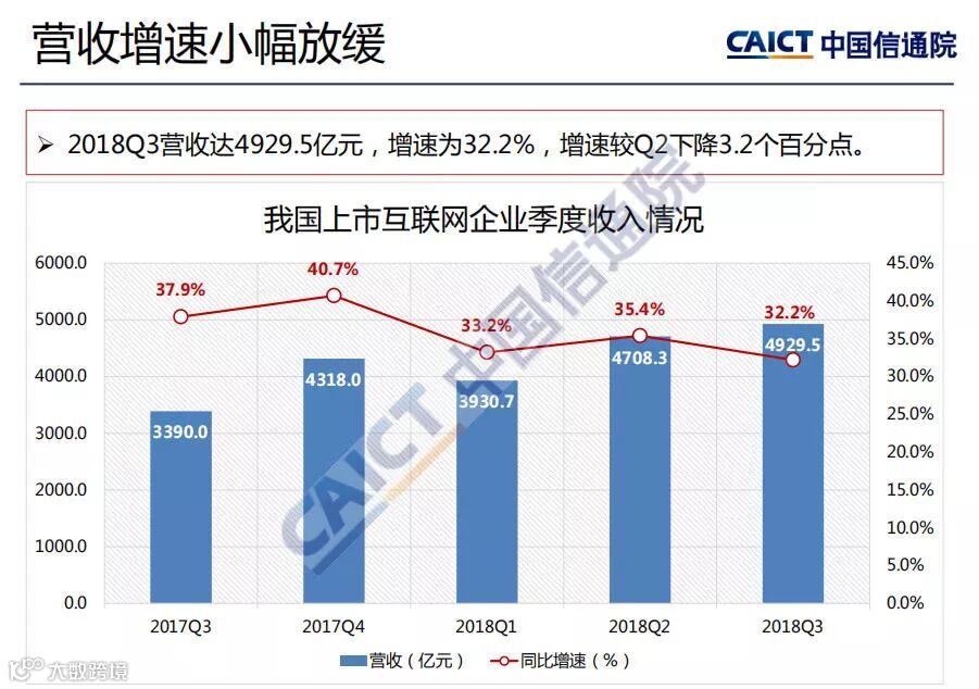 据统计,2018Q3我国上市互联网企业营收达4929.5亿元,增速为32.2%,增速较Q2下降3.2个百分点。