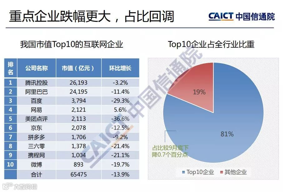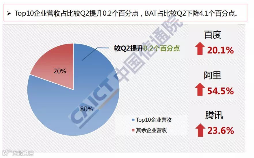 Top企业营收占比却比Q2提升了0.2个百分点,Top企业营收占上市互联网企业80%,市场结构持续向头部企业集中,虽BAT占比较Q2下降了4.1个百分点,但BAT头部位置难颠覆。