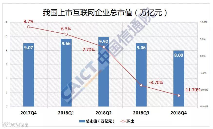 第四季度我国上市互联网企业总市值达到8万亿元,市值普遍发生了严重的缩水,我国85%的互联网企业市值环比出现负增长,其中,有半数公司的股价跌幅均超50%,且趣头条、三六零、爱奇艺、唯品会、虎牙这五家公司的股价距2018最高峰时更是跌近了70%。