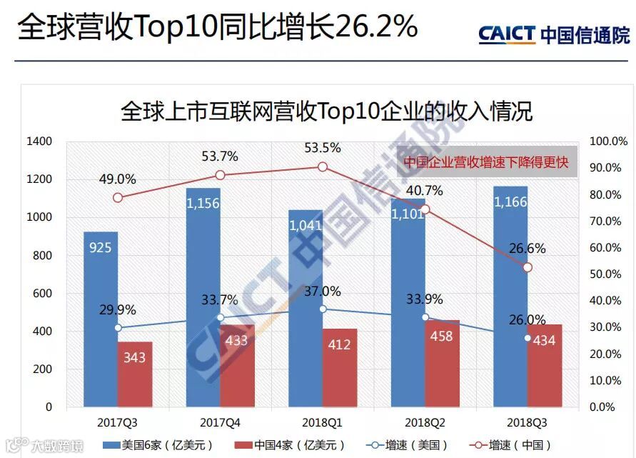 虽然2018Q3我国上市互联网企业营收增速小幅放缓,但是全球营收Top10同比增长26.2%,其中中国企业有4家,但是中国企业营收增速下降得更快。