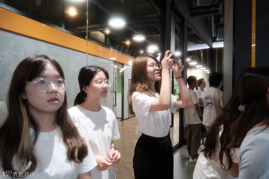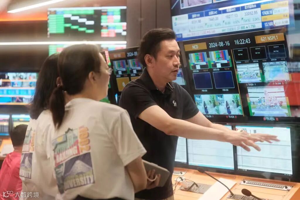 接下来,科考队员们实地探访了总控室。工作人员们正在办公区域调试节目放送情况,正中央大屏幕上同步出现十几个分屏,展示不同的节目画面。同学们进入控制中心,向电视台工作人员了解如何操作运行。工作人员向大家解释显示中的两套时间(北京时间和国际时间),说明国际台和本地台的节目差异、具体节目时间安排以及演示节目转播过程。