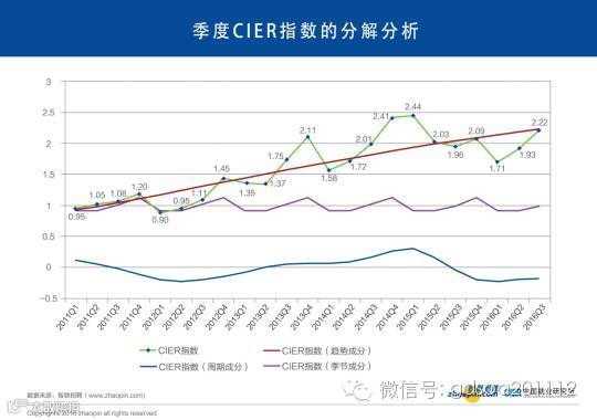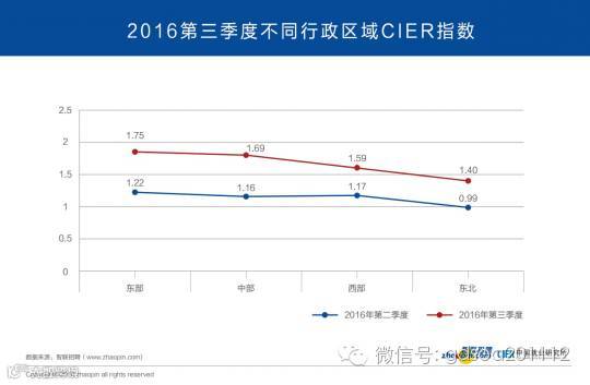 2016年第一季度春节期间,企业需求人数基本持平,然而求职申请人数明显增加,使得CIER指数有所下降;2016年第二季度迎来招聘旺季,需求人数增幅明显高于申请人数,因此CIER指数上升至1.93;进入2016年第三季度,随着“供给侧改革”的政策落地,以及新经济行业的发展助力,宏观经济指标有所回升,也带动了劳动力市场中企业招聘人数有小幅的上升,与此同时,受周期性因素的影响,同期的求职申请人数有一定程度的回落,使得CIER指数持续上升至2.22。
