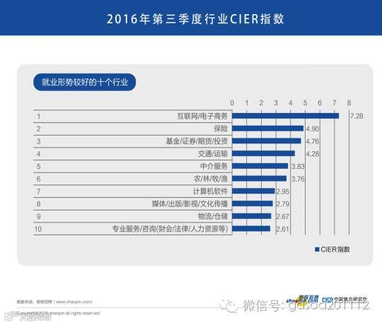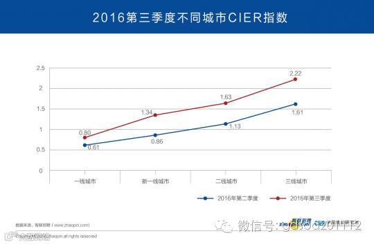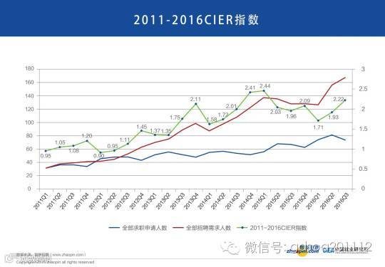 2016年第三季度,中国经济增长好于市场预期,GDP增速6.7%,基本保持平稳。中国领先的职业发展平台智联招聘与中国人民大学中国就业研究所联合推出CIER(中国就业市场景气指数)[CIER指数是用来反映就业市场景气程度的指标,其计算方法是:CIER指数=市场招聘需求人数/市场求职申请人数。CIER指数以1为分水岭,指数大于1时,表明就业市场中劳动力需求多于市场劳动力供给,就业市场竞争趋于缓和,就业市场景气程度高,就业信心较高。指数越大则就业市场的景气程度越高。当CIER指数小于1时,说明就业市场竞争趋于激烈,就业市场景气程度低,就业信心偏低。],反映就业市场的整体走势。该指标采用智联招聘(zhaopin.com)全站数据分析而得,通过不同行业、城市职位供需指标的动态变化,来反映就业市场上职位空缺与求职人数的比例的变化,从而起到监测中国就业市场景气程度以及就业信心的作用。