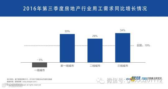 2016年下半年房地产行业再次出现井喷的发展态势,一线及新一线城市房价增长速度尤其明显,部分二线城市也出现了“一房难求”的局面,行业的招聘需求同比增长了19%。
