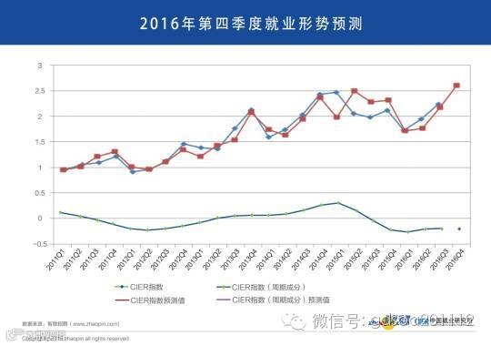基于计量模型的预测显示,第四季度CIER指数有可能出现上升趋势,主要是叠加季节性因素、劳动力市场长期的供不应求的趋势,以及周期成分企稳的影响。总体上来看,2016年底就业形势将大概率呈现趋稳向好的态势。