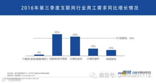 2016年以来,互联网行业中充斥着投资萎缩、大型公司合并等新闻,资本寒冬成为互联网中的“新常态”。但以共享经济、VR、AR、直播平台等为代表的新型互联网经济在中国迅速发展,成为拉动行业发展的新引擎。第三季度IT互联网的用工需求同比增加45%,持续焕发出旺盛的生命力。
