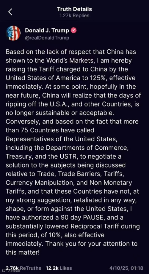 北京时间4月10日凌晨,特朗普宣布将对华关税提高至125%,同时暂停对其他75个国家加征额外关税(只留10%),有效期为90天。