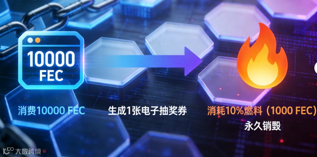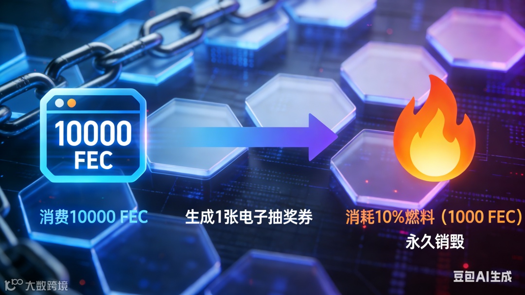 为什么我们说 FEC 越花越有?当我们在生态内消费1万个 FEC 电子优惠券,系统会自动消耗10%作为燃料生成一个电子抽奖券,那么这里消耗的10%作为燃料被永久的销毁,做到了控制总量,抗通胀的一个作用。我们抽奖券的回馈是分为100期的抽奖,释放,不鼓励快进快出,让这个消费形成闭环,而不是一次性的一个刺激,采用消费产生奖励再消费的一个商业复购的逻辑。正因为这样,我们才赢来了我们 F E C 的2.0的一个版本。