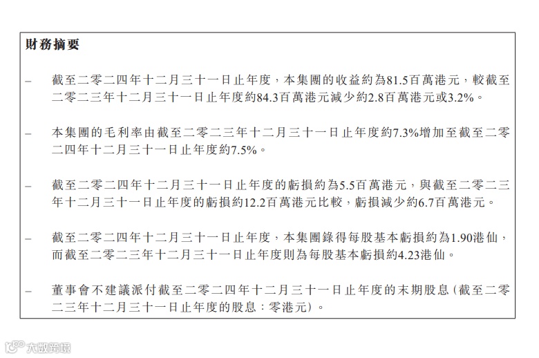 每股亏损:由2023年的4.23港仙降至2024年的1.90港仙。