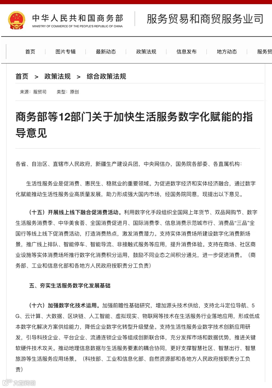 在数字经济蓬勃发展的背景下,商务部等十二部门发布指导意见,提出在实体消费场所推行数字化消费积分,鼓励跨业态积分通兑,以促进消费。同时,政策支持北斗、5G、区块链等技术在生活服务行业应用,旨在降低企业数字化转型成本。