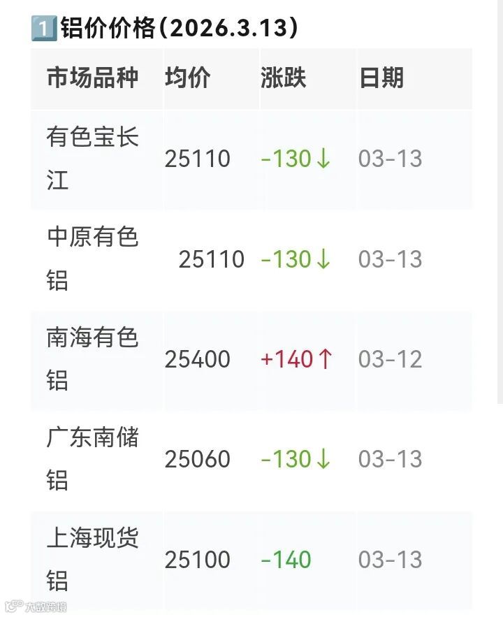 跌|3月13日铝锭价格