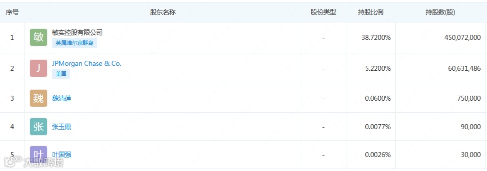 敏实集团前身为1992年成立的宁波敏孚机械有限公司,实际控制人为秦荣华和魏清莲夫妇,通过敏实控股有限公司间接持有38.78%股份,是集团核心决策者,股东情况如下: