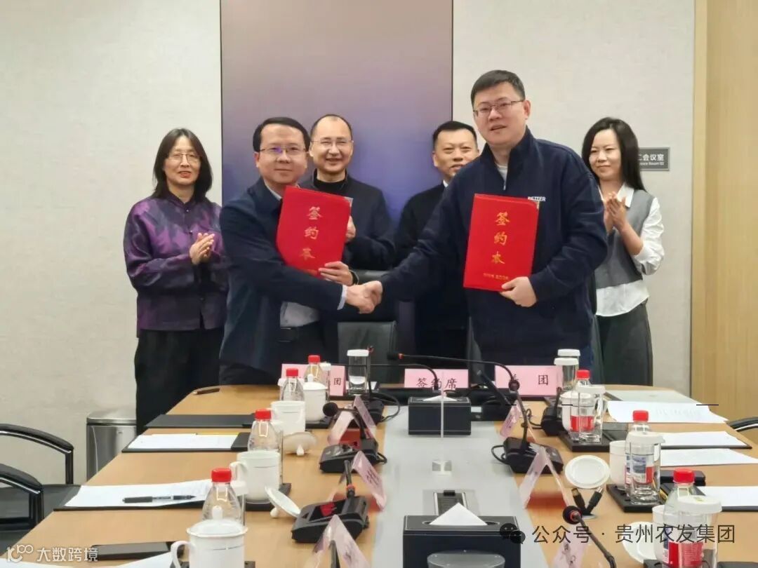 贵州农发集团党委委员、副总经理邓荣光与美团高级公共事务总监赵刚代表签约,贵州农发集团党委书记、董事长芦忠于,美团副总裁李宁,美团高级公共事务总监孟得红,贵州省人民政府驻北京办事处经济处处长、二级巡视员宁贵明出席并见证了本次签约。