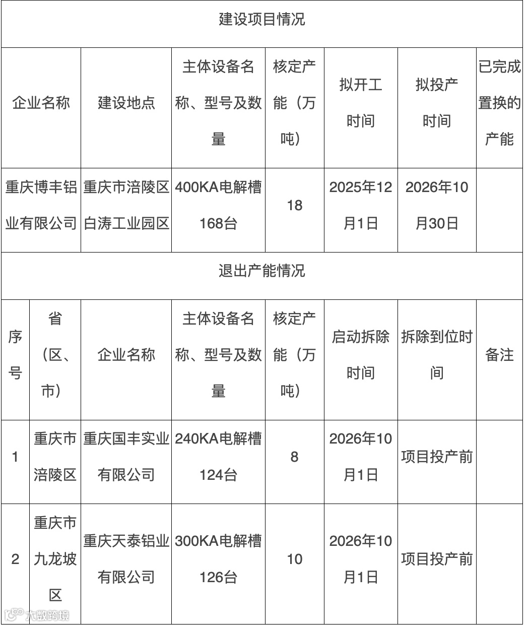 【产能置换】关于重庆博丰铝业建设18万吨电解铝项目产能置换方案及重庆天泰铝业、重庆国丰实业电解铝产能退出的公告