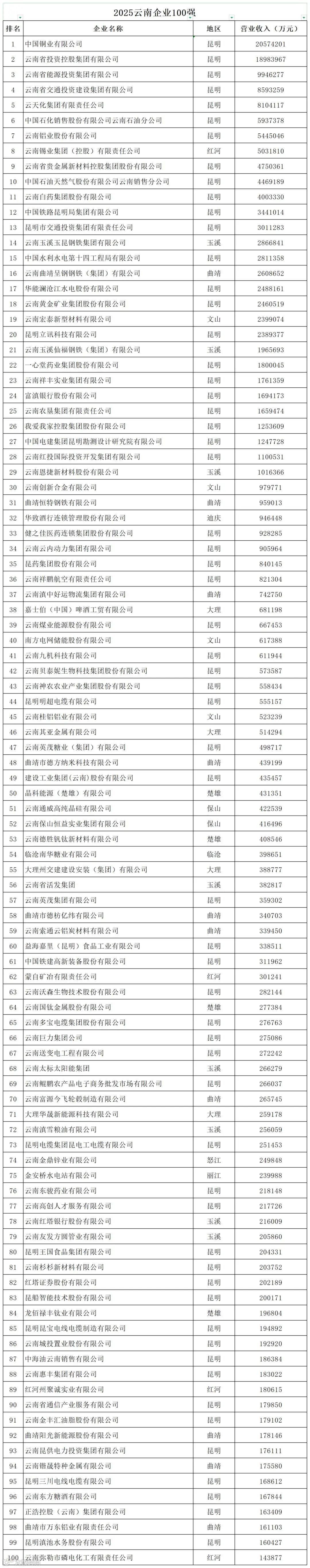 2025云南企业100强名单发布