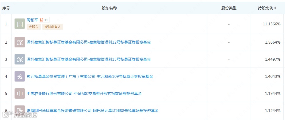 股权结构:大股东周和平,持股比例11.1366%,持股1%以上股东如下:。