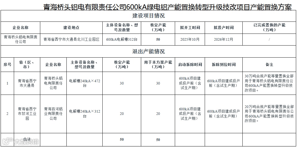 产业与招商4月8日,青海省工信厅发布《关于青海桥头铝电有限责任公司600kA绿电铝50万吨产能置换转型升级技改项目产能置换方案的公示》。