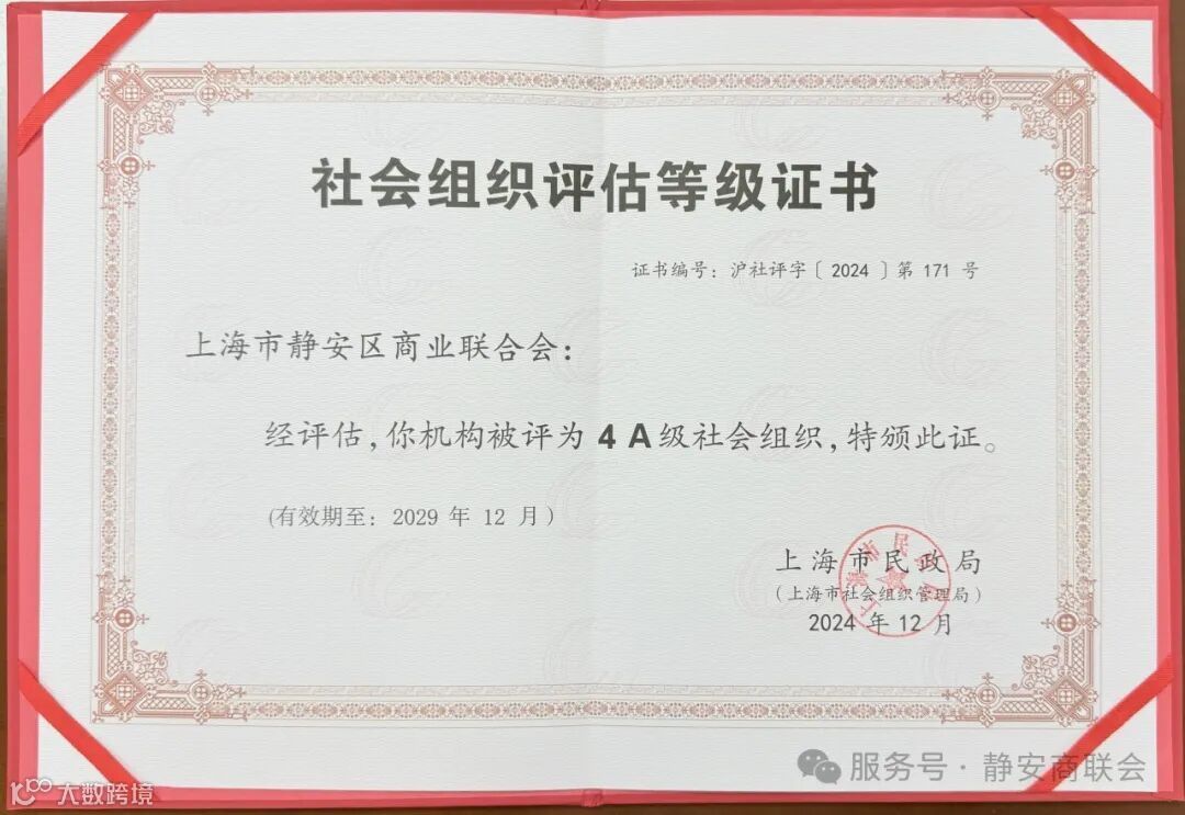 上海市静安区商业联合会荣获上海市社会组织评估4A等级。