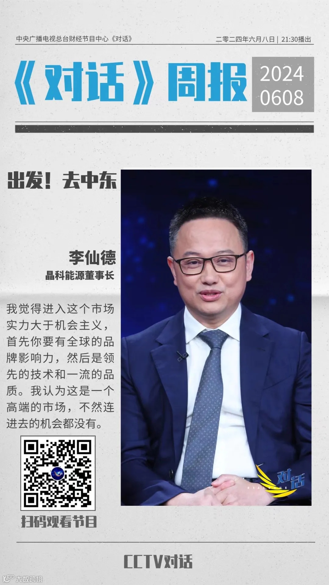 5月8日,央视财经频道《对话》特别节目“出发!去中东”正式播出,晶科能源董事长李仙德与多位企业家和专家学者围绕中东市场展开了深度交流和对话。一起来看看,他们都分享了哪些话题?
