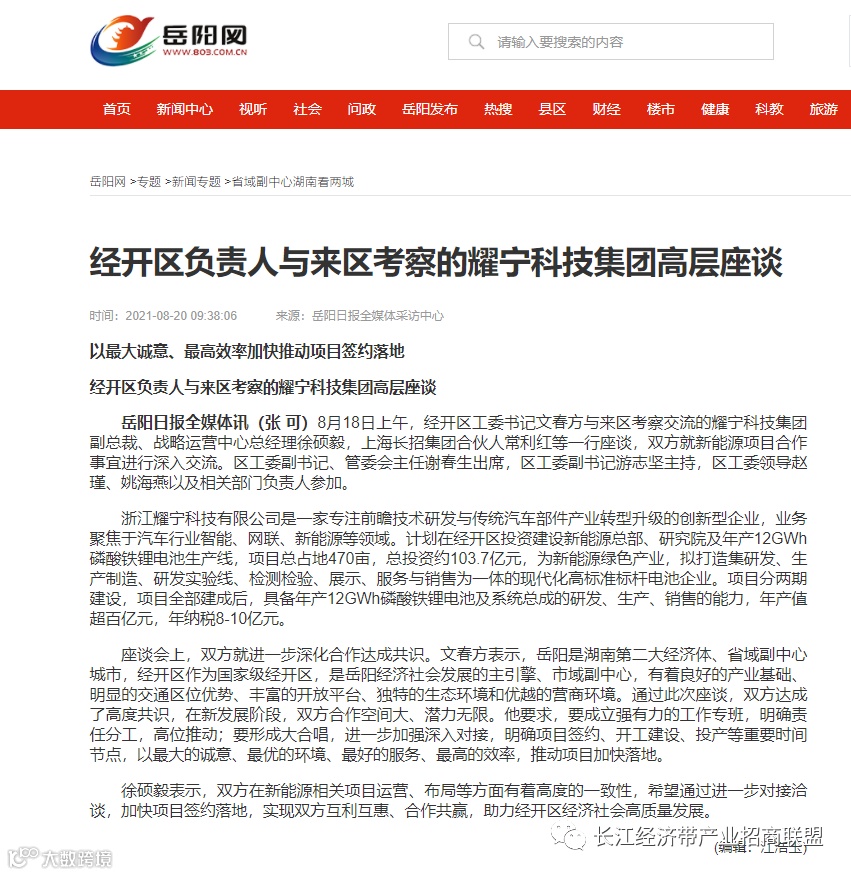 转载岳阳日报全媒体讯8月18日上午,区工委书记文春方与来区考察交流的耀宁科技集团副总裁、战略运营中心总经理徐硕毅,上海长招集团合伙人常利红等一行座谈,双方就新能源项目合作事宜进行深入交流。区工委副书记、管委会主任谢春生出席,区工委副书记游志坚主持,区工委领导赵瑾、姚海燕以及相关部门负责人参加。