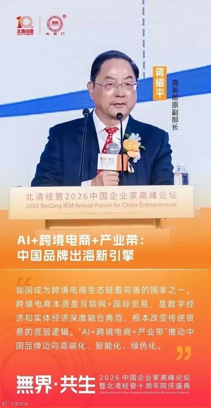 商务部原副部长 蒋耀平:“我国成为跨境电商生态链最完善的国家之一。跨境电商本质是 “互联网 + 国际贸易”,是数字经济与实体经济深度融合的典范,根本改变传统贸易的底层逻辑。“Al+跨境电商+产业带”推动中国品牌迈向高端化、智能化、绿色化。”