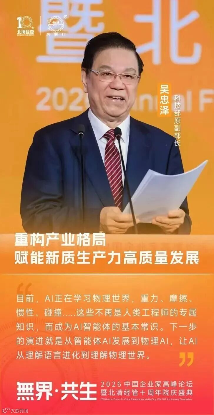 科技部原副部长 吴忠泽 :“目前,Al正在学习物理世界,重力、摩擦、惯性、碰撞......这些不再是人类工程师的专属知识,而成为Al智能体的基本常识。下一步的演进就是从智能体Al发展到物理AI,让AI从理解语言进化到理解物理世界。”