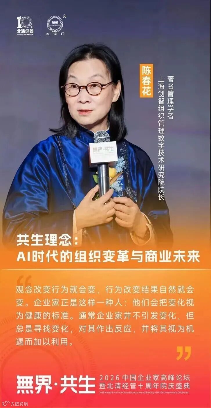 著名管理学者、上海创智组织管理数字技术研究院院长 陈春花:“观念改变行为就会变,行为改变结果自然就会变。企业家正是这样一种人:他们会把变化视为健康的标准。通常企业家并不引发变化,但总是寻找变化,对其作出反应,并将其视为机遇而加以利用。”