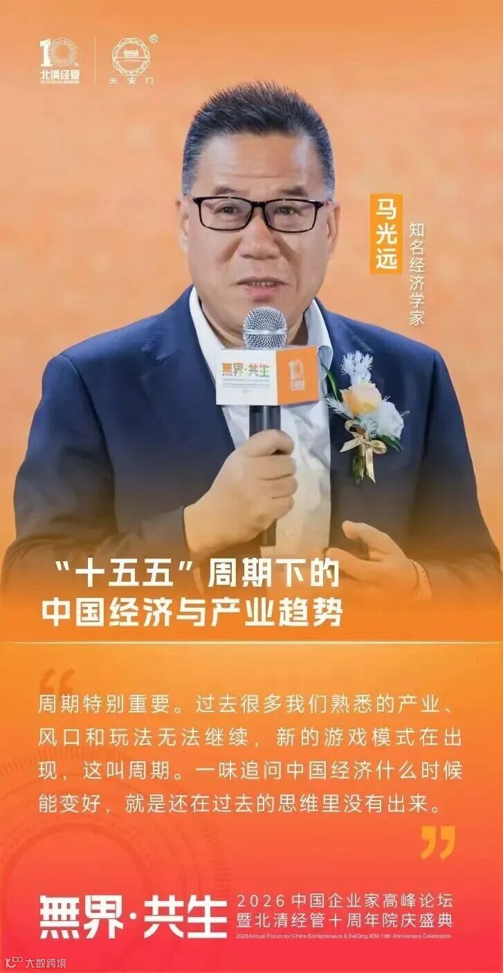 知名经济学家 马光远 “周期特别重要。过去很多我们熟悉的产业、风口和玩法无法继续,新的游戏模式在出现,这叫周期。一味追问中国经济什么时候能变好,就是还在过去的思维里没有出来。”