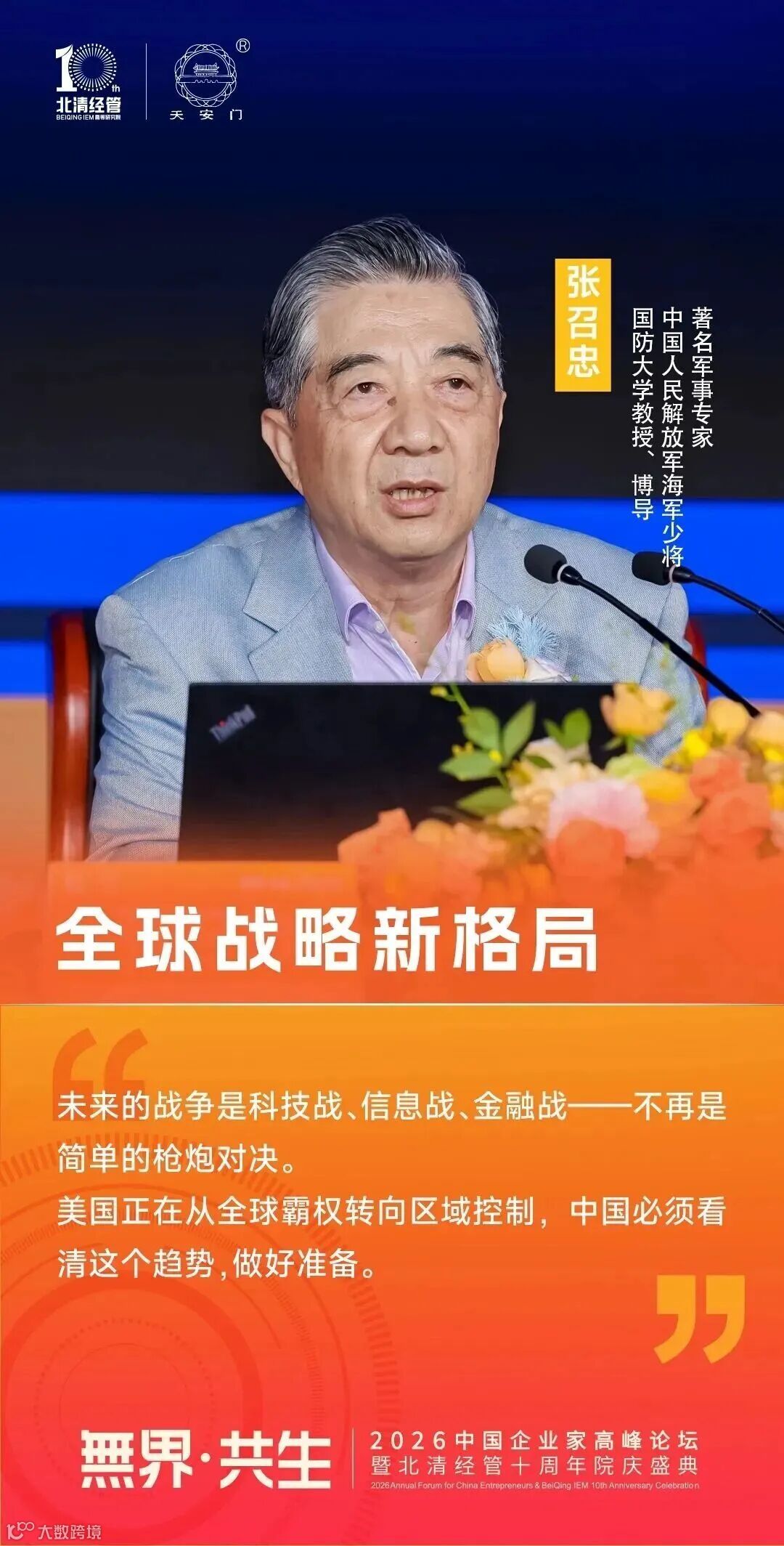 著名军事专家、中国人民解放军海军少将、国防大学教授 / 博导 张召忠:“未来的战争是科技战、信息战、金融战 —— 不再是简单的枪炮对决。美国正在从全球霸权转向区域控制,中国必须看清这个趋势,做好准备。”