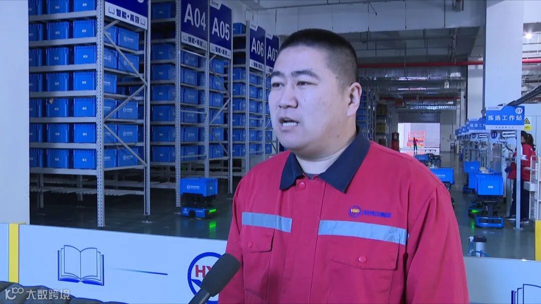 宏贤达科技集团有限公司电商部库房副经理翟鹏辉:“在客户下了订单之后,通过专业的系统算法对订单内图书商品进行一个计算分配,机器人根据相应的指令进行搬运作业。相较于之前,我们现在的拣货效率提高了3.3倍,存储量提高了3倍,日处理订单峰值达到了7万+。”