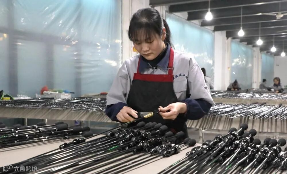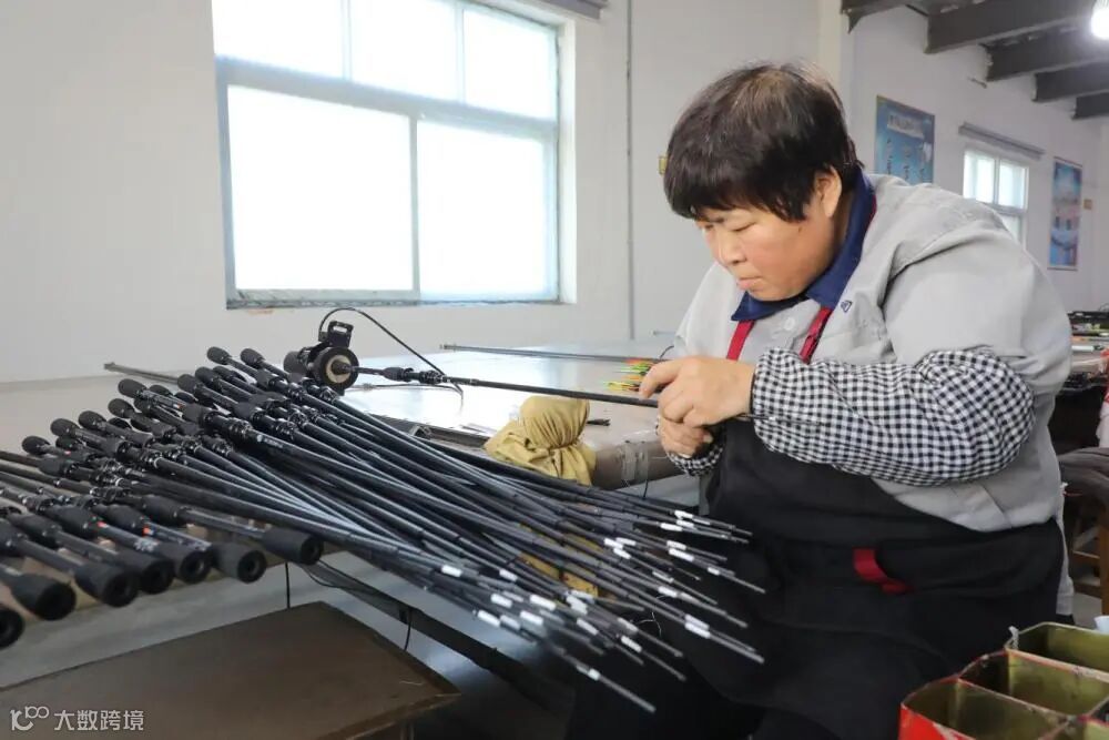 ↑12月3日,在固安县一体育器材企业,工人在组装渔具产品。