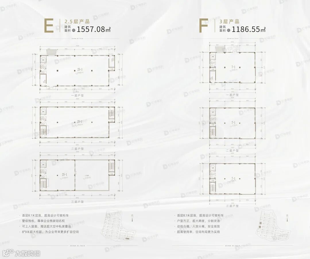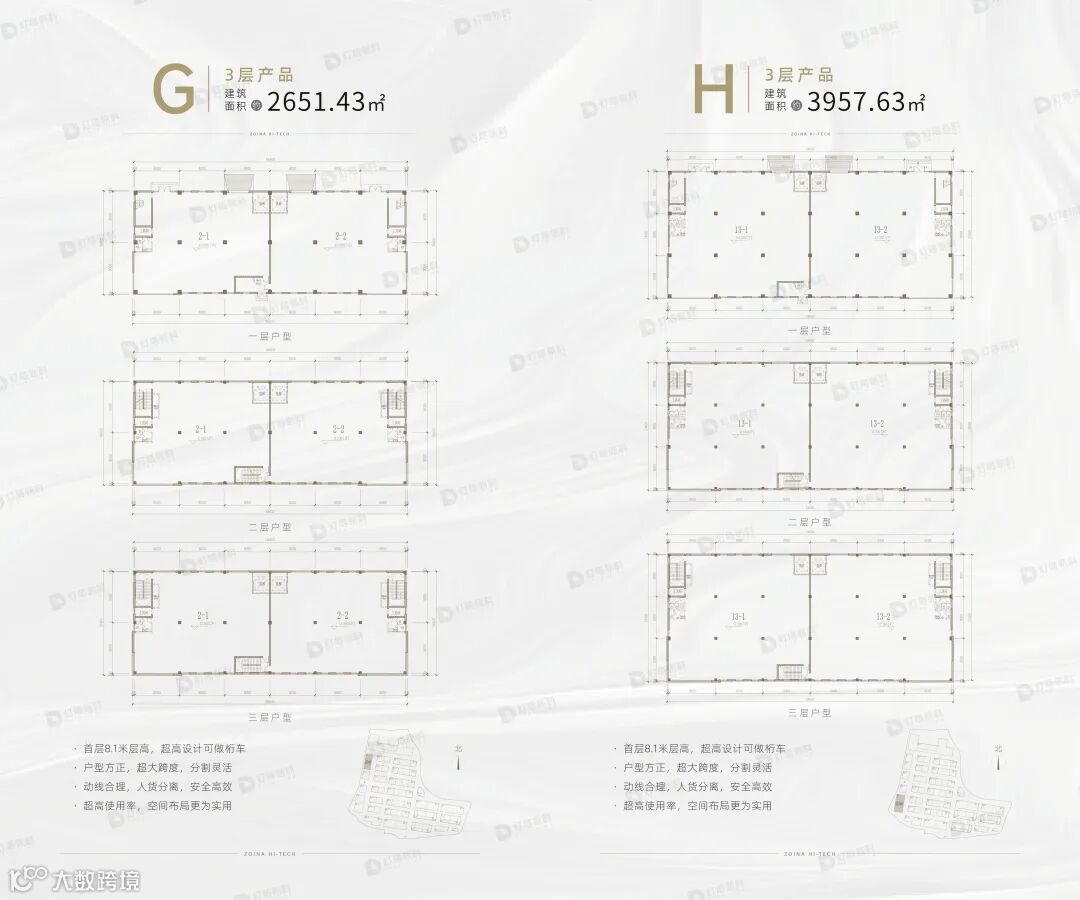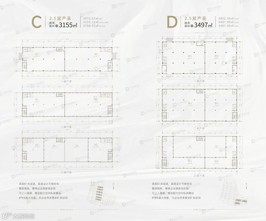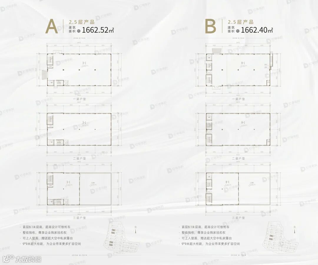 产品类型多样,包括2.5层独栋、双拼及3层独栋厂房,层高最高达8.1米,适应多种生产需求。