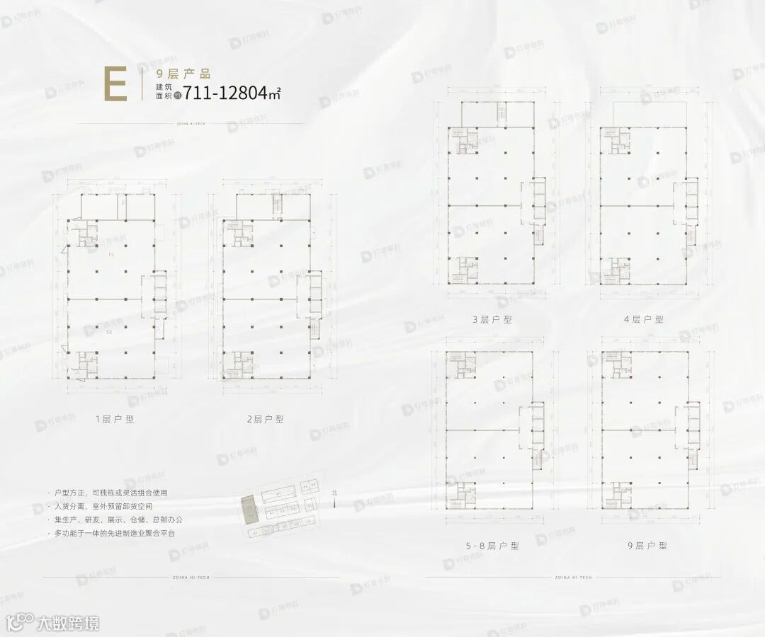 产品类型丰富,涵盖标准厂房、高层办公及产业大厦,包括9层分层和3-3.5层独栋多元空间。