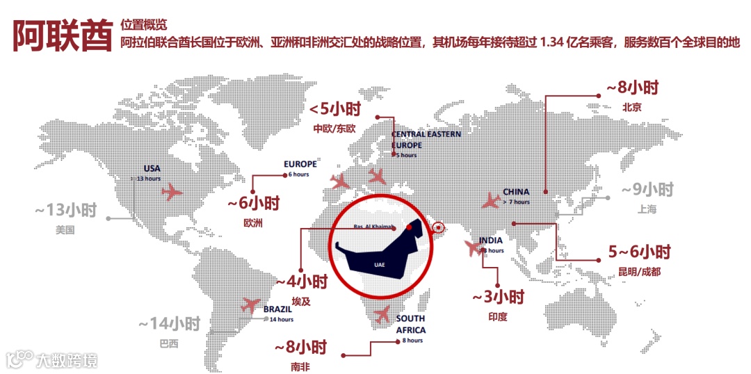 北临波斯湾,8 小时飞行覆盖 76% 全球人口,迪拜国际机场年客流 1.34 亿,杰贝阿里港为中东最大集装箱港。 -