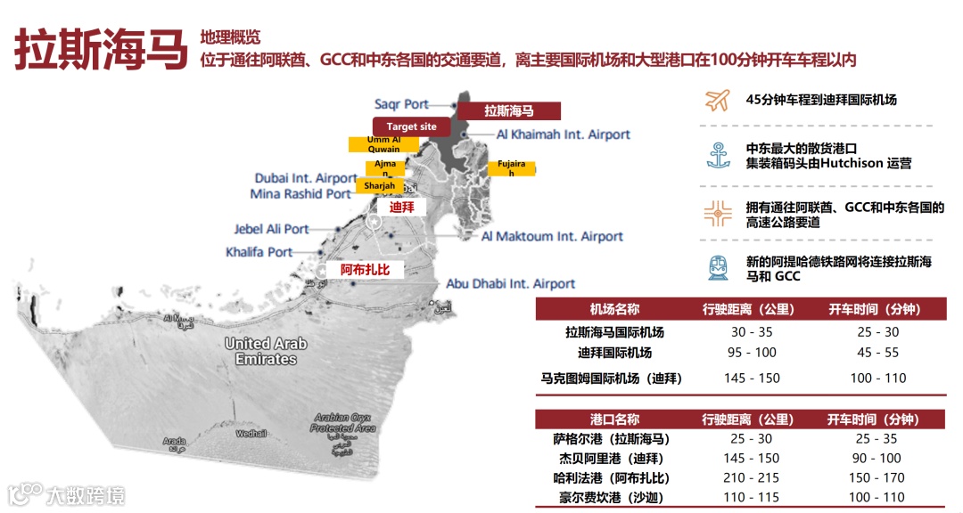 距迪拜机场 45 分钟车程,萨格尔港(中东最大散货港)25 分钟,新阿提哈德铁路网通车后可直达 GCC 各国。 -