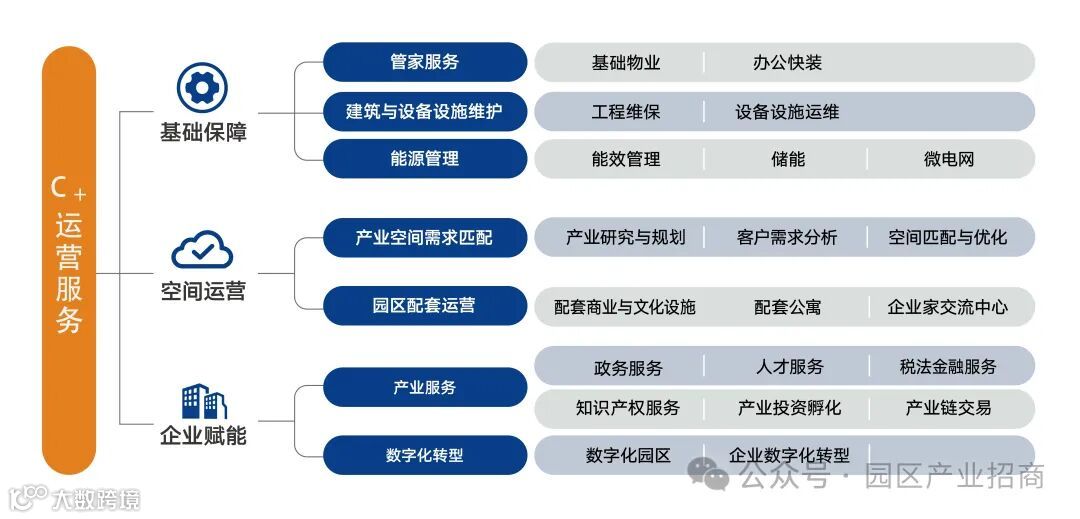 包括基础保障、空间运营、企业赋能三大服务类别,包含7大子类、21个服务项,并通过能力自建和整合优质合作方资源,将为园区企业提供近100个服务项目和解决方案。基于为客户创造价值为导向,基于客户核心需求而构建的企业服务体系,为入园企业提供降本、增效、提质,以及跨越式发展的系统性解决方案和优质服务,为合作伙伴构建了深度服务、共享资源的平台,从产业园到产业社区,逐步形成共生、共创、共赢的产业发展生态。
