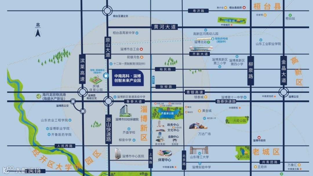 项目地处淄博桓台县裕民路与耀昌路交汇处,占据淄博城市发展主轴核心地带。3公里直达齐盛湖城市核心区,10分钟车程覆盖淄博核心配套资源;5分钟接驳济青、滨莱高速,3公里直达淄博西高速口,5公里辐射淄博北站高铁枢纽,形成"高速+高铁+城市主干道"三位一体的黄金交通网。无论是原料运输、人才流通还是市场开拓,皆可高效触达环渤海经济圈,为企业铺设通向全国的战略通道。