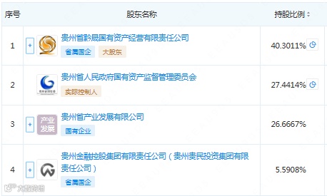 股东结构:贵州省黔晟国有资产经营有限责任公司(40.30%)、贵州省国资委(27.44%)、产业发展有限公司(26.67%)、贵州金融控股集团(5.59%)。