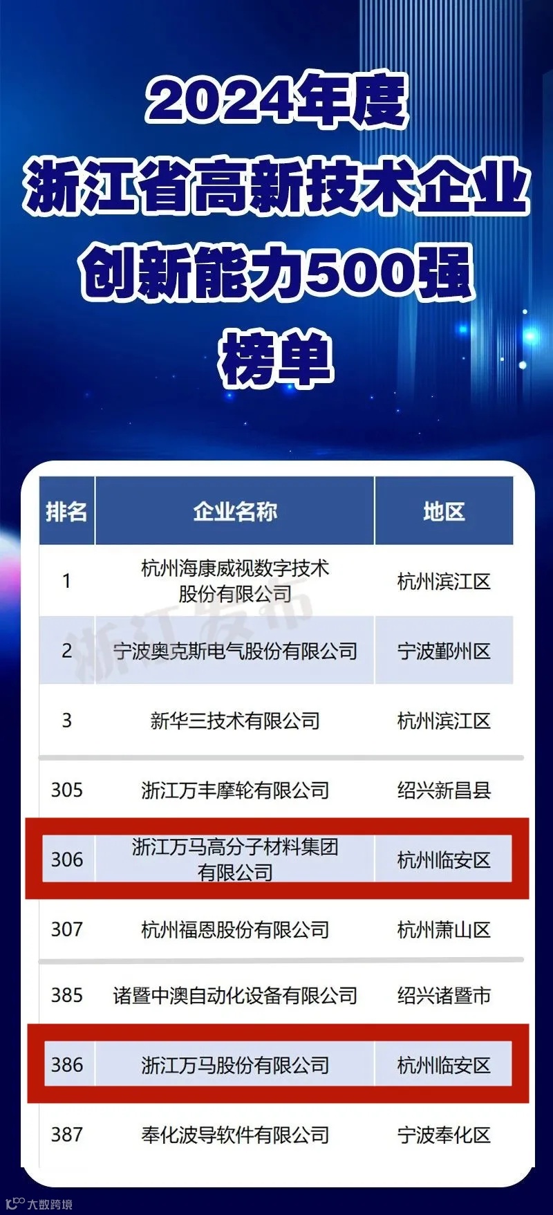 近日,浙江省科技信息研究院受浙江省高新技术企业协会委托,通过多指标的综合对比,正式发布“2024年度浙江省高新技术企业创新能力500强”榜单,万马股份、万马高分子凭借卓越的技术创新和稳健的发展态势成功入围。