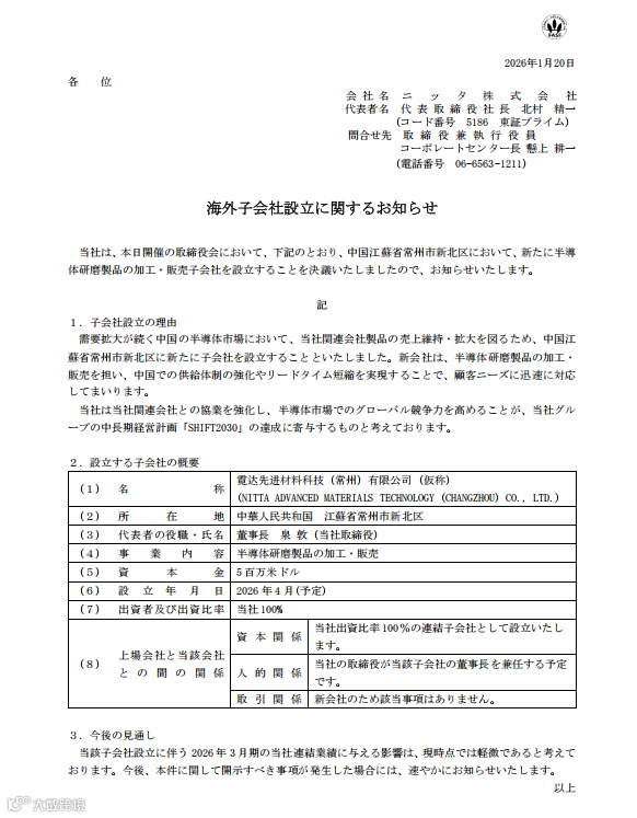 日本NITTA株式会社发布公告,决议在江苏省常州市新北区新设一家半导体研磨制品加工与销售子公司。