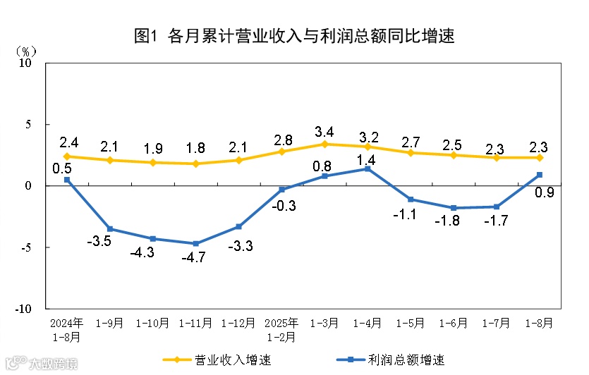于卫宁指出,1—8月份,规模以上工业企业营业收入同比增长2.3%,与1—7月份持平。其中,8月份工业企业营业收入增长1.9%,较7月份加快1.0个百分点,营业收入增长加快,为企业盈利继续恢复创造有利条件。