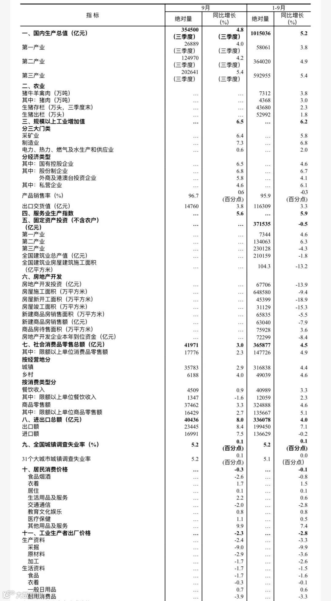 ◆ 初步核算,前三季度国内生产总值1015036亿元,按不变价格计算,同比增长5.2%