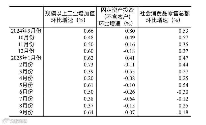 (2)根据季节调整模型自动修正结果,对近一年来各期国内生产总值、规模以上工业增加值、固定资产投资(不含农户)、社会消费品零售总额环比增速进行修订。修订结果及2025年三季度GDP环比数据、2025年9月份其他指标环比数据如下: