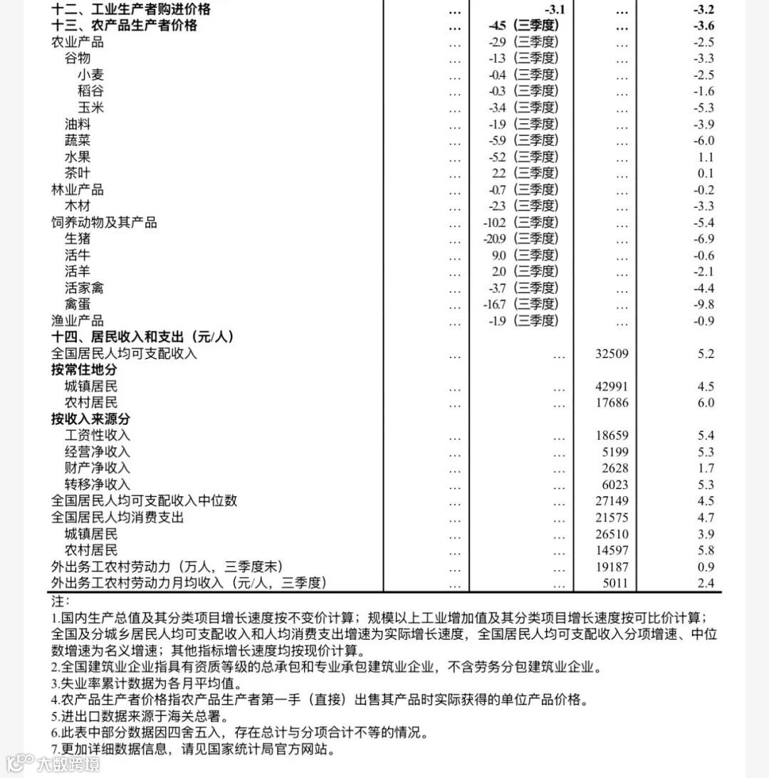 前三季度,农业(种植业)增加值同比增长3.6%。全国夏粮早稻产量合计17825万吨,比上年增加19万吨,增长0.1%。秋粮生产总体稳定,全年粮食有望再获丰收。前三季度,猪牛羊禽肉产量7312万吨,同比增长3.8%,其中,猪肉、牛肉、禽肉产量分别增长3.0%、3.3%、7.2%,羊肉产量下降4.3%;牛奶产量增长0.7%,禽蛋产量增长0.2%。三季度末,生猪存栏43680万头,同比增长2.3%;前三季度,生猪出栏52992万头,增长1.8%。