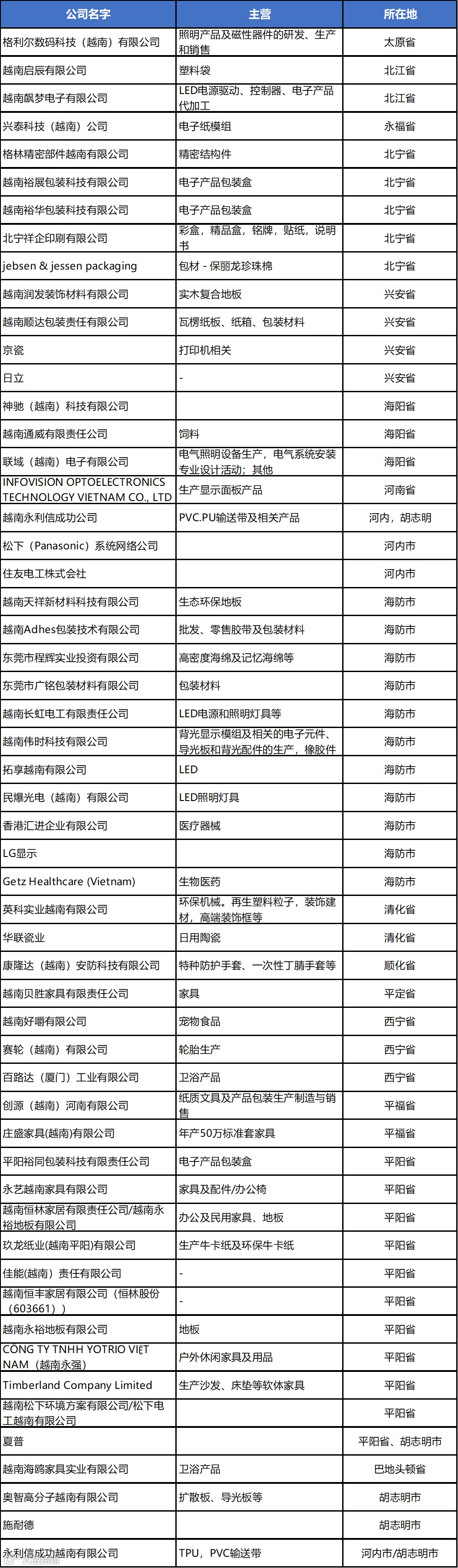 同奈省:宝元鞋厂、天虹仁泽西宁省:信泰越南、海利得海阳省:钰兴/钰腾鞋业、超盈越南