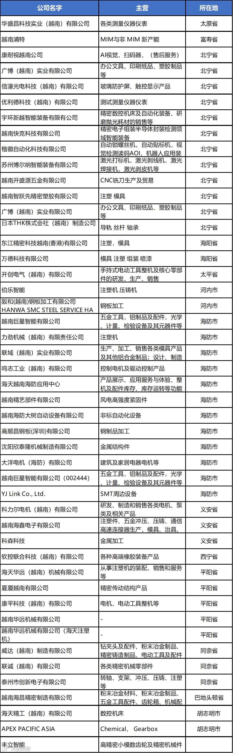 北宁省:康耐视越南、楷徽自动化海防市:力劲机械、鸣志工业平阳省:海天华远、夏厦越南