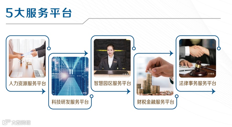 人力资源服务平台、科技服务平台、智慧园区管理平台、金融服务平台、法律服务平台。