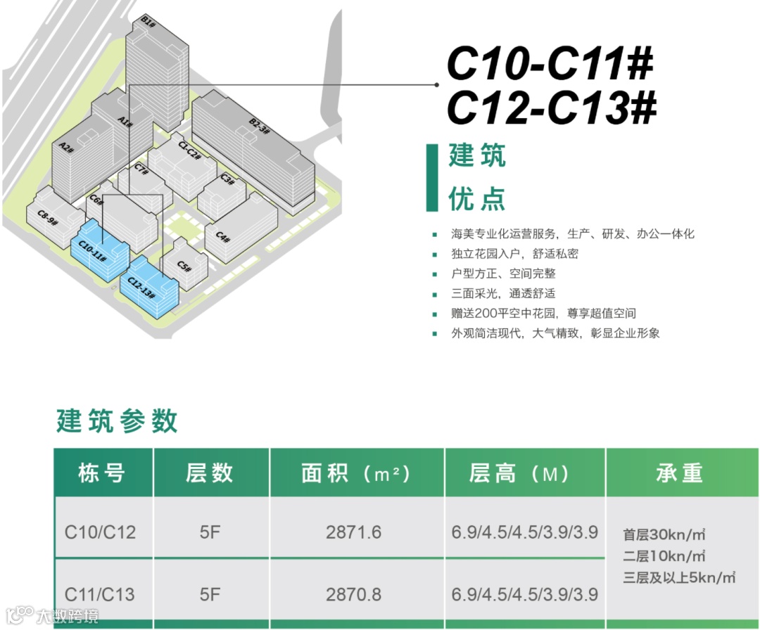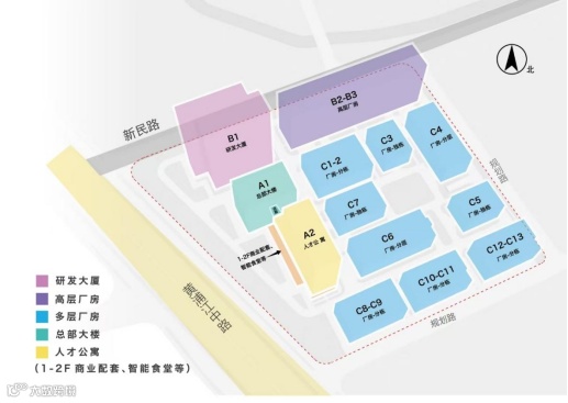 项目共高层厂房2幢、多层厂房9幢、办公研发楼1幢、生活配套楼(人才公寓)1幢。