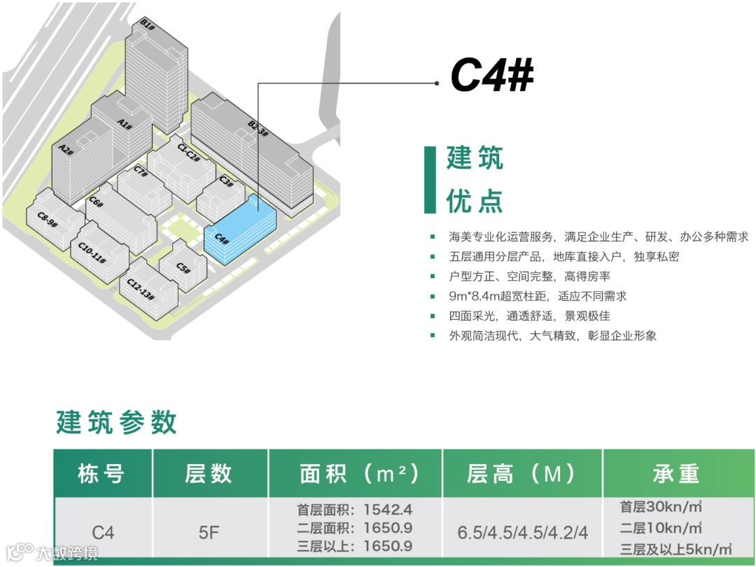 四层独栋产品单栋面积约3400~4200㎡,单层面积约880㎡,层高:7.2/5.4/4.5/4.5m